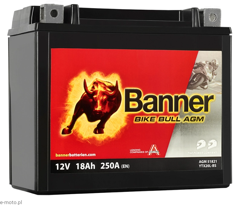 Akumulator Banner Bike Bull AGM 518 21 to wydajne i niezawodne źródło energii dla większych motocykli, skuterów, quadów oraz innych pojazdów wymagających wysokiego prądu rozruchowego i stabilnego napięcia. Wykonany w technologii AGM (Absorbent Glass Mat), zapewnia bezobsługową eksploatację i wyjątkową odporność na wibracje oraz wstrząsy.