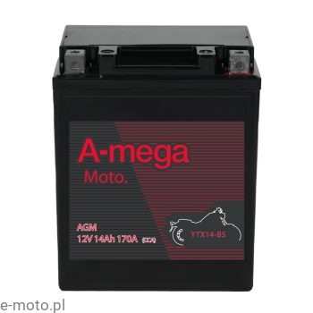 Akumulator A-MEGA Moto YTX14-BS 12V 14Ah 170A to motocyklowy akumulator rozruchowy wykonany w technologii AGM VRLA, przeznaczony do jednośladów oraz pojazdów typu powersport wymagających stabilnego i pewnego zasilania rozruchowego.