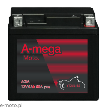 Akumulator A-MEGA Moto YTX5L-BS 12V 5Ah 65A to motocyklowy akumulator rozruchowy wykonany w technologii AGM VRLA, przeznaczony do małych pojazdów wymagających pewnego startu, stabilnej pracy oraz pełnej bezobsługowości.