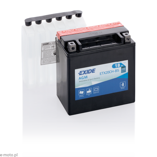 - Akumulator motocyklowy Exide ETX20CH-BS wykonany w technologii AGM (Absorbent Glass Mat), elektrolit wchłonięty w maty z włókna szklanego