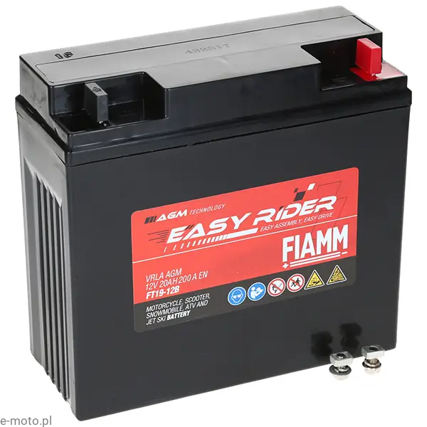 Akumulator Fiamm Easy Rider FT19-12B 20Ah 200A 12V to wydajne źródło energii zaprojektowane z myślą o motocyklach oraz pojazdach rekreacyjnych wymagających niezawodnego rozruchu i wysokiej odporności na warunki eksploatacyjne. Wykonany w technologii AGM (Absorbent Glass Mat), zapewnia pełną bezobsługowość oraz zwiększoną odporność na wibracje i przechyły.