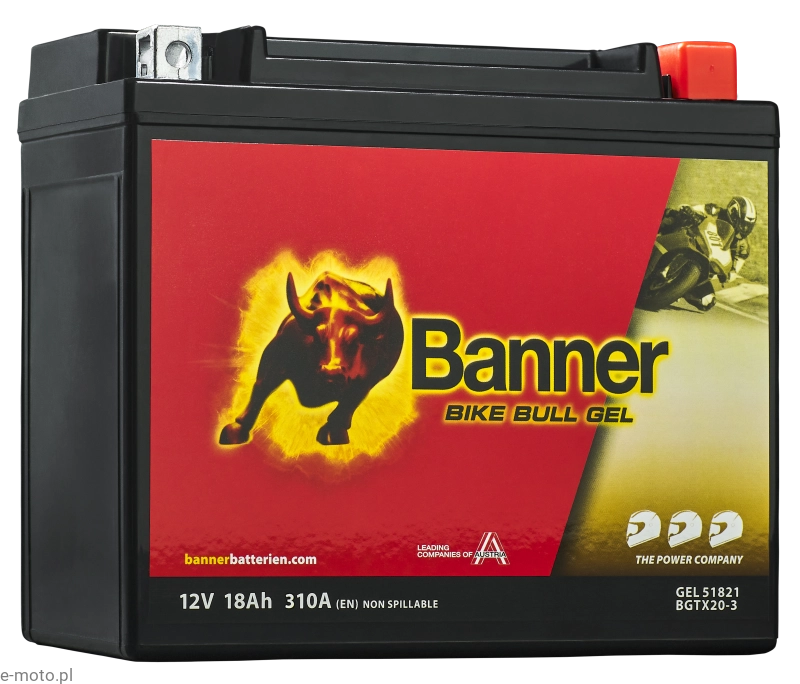 Akumulator Banner Bike Bull GEL 518 21 to wysokiej klasy akumulator motocyklowy wykonany w nowoczesnej technologii GEL, przeznaczony do motocykli, skuterów, quadów oraz innych pojazdów z rozbudowaną instalacją elektryczną. Zastosowanie elektrolitu w postaci żelu sprawia, że akumulator jest całkowicie szczelny, bezobsługowy i wyjątkowo odporny na wibracje oraz przechyły.